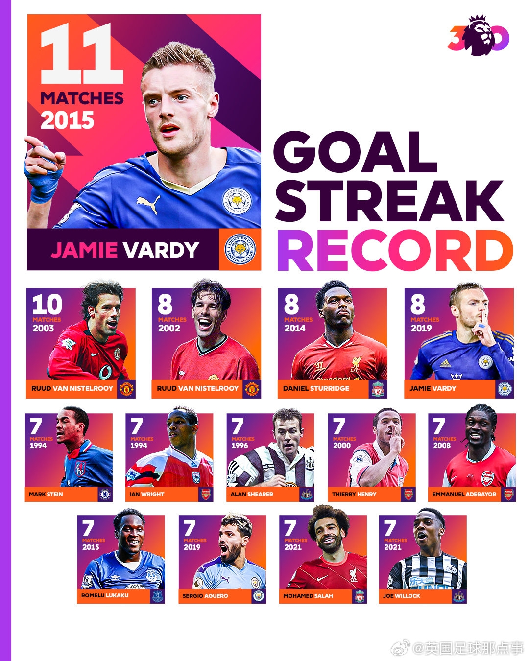 ⭐英超连续进球场次纪录(11场,15-16赛季)